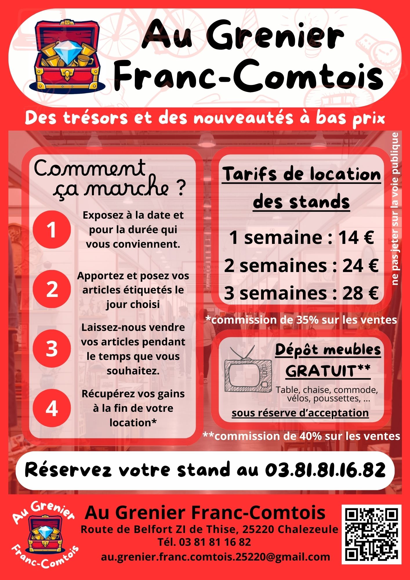 En outre, l’entreprise met également à la disposition des particuliers un espace pour vendre leurs articles en magasin. Vous pouvez réserver une table ou déposer vos meubles et autres objets. Comme dans un marché aux puces traditionnel, vous pouvez toujours vous attendre à trouver de nouveaux articles chaque semaine.